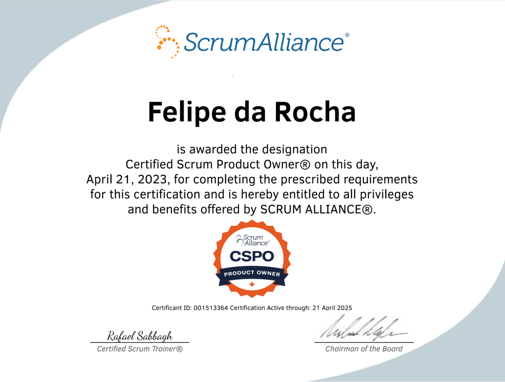 Hey, I’m Felipe! I’m a product and project management professional with over a decade of experience, specializing in agile methodologies and strategic execution. With a degree in Production Engineering and certifications like CSPO, Microsoft MB910 and Lean Six Sigma – Green Belt, I’ve taken on roles ranging from Business Analyst to Product Manager and Scrum Master, helping teams transform ideas into impactful solutions. Currently, I lead more than 10 connected product initiatives at EDP, 6 squads and over 60 people managing and overseeing the entire product lifecycle — from ideation to value delivery.